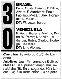 Sin jugar bien, nuevamente abucheado por su público, el equipo de Wanderley Luxemburgo debió trajinar mucho para conseguir la tranquilidad de una buena diferencia que sólo alcanzó en los últimos minutos. Los venezolanos marcaron con orden y duramente, y a Brasil le faltaron variantes pese a que el gol tempranero de Ronaldinho –resolvió en el segundo palo un largo envío de Baiano– pudo simplificarle el partido. Con este resultado la clasificación brasileña junto a Colombia es casi número puesto. Como en el caso de Argentina, el fútbol sigue en deuda.