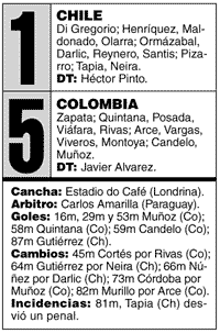 Colombia salió decidida a buscar de entrada el triunfo que necesitaba. Con un buen manejo de los volantes, con la subida continua de los laterales y con la peligrosidad de Muñoz, el conjunto de Javier Alvarez dominó en todos los sectores de la cancha. Así llegó al primer gol, que sería el principio del fin para los chilenos. El lateral Quintana anticipó a Pizarro (tal vez con falta), desbordó por la derecha y lanzó un centro perfecto para que Muñoz convirtiera el primero.