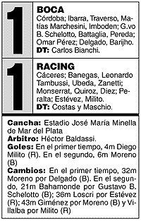 En el arranque del segundo, Cáceres –en su única vacilación– dio rebote ante un tiro libre de Pérez y Moreno tocó al gol. Y enseguida otra vez el arquero sacó un cabezazo del enganche. A partir de ahí el trámite se hizo más parejo y Racing comenzó a llegar más, siempre llevado por Peralta y con la única carta ofensiva del joven Milito, que por dos veces –siempre por derecha– pudo definir: una vez se le cruzó en el disparo Marchessini con el brazo pegado al cuerpo y en la última hizo todo bien y a Córdoba lo salvó el palo.
