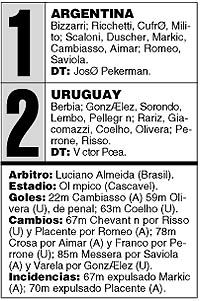 El primer tiempo fue lo mejor de Argentina en lo que va del torneo. Luego de un ligero predominio celeste en el arranque, los chicos de Pekerman revirtieron la pobre imagen exhibida hasta ahora. Con la dinámica de Duscher y Scaloni en la mitad de la cancha, el atrevimiento de Aimar para desequilibrar y con la velocidad de Saviola arriba, el Sub-23 comenzó a dominar el juego. El toqueteo intrascendente se modificó por pases precisos y cambio de ritmo, algo que hasta ahora no había aparecido. Por eso no estaba mal el 1-0 parcial, luego de una volea espectacular de Cambiasso tras un fallido rechazo de Lembo. Con la ventaja, la tranquilidad argentina creció, lo que se tradujo en el desarrollo. Uruguay aparecía perdido en la cancha, entre Scaloni y Markic se ocupaban de Olivera, y Bizzarri no pasaba sobresaltos. Además, Argentina estuvo a punto de empezar a liquidar el partido, pero un fallo inexplicable del árbitro brasileño Luciano Almeida le privó del segundo gol. Duscher llegó hasta el fondo y envió el centro para Saviola. El delantero de River la empalmó de primera, aunque su remate lo devolvió el travesaño. Sin embargo, Romeo aprovechó el rechazo corto del arquero para marcar el tanto. Por recomendación del asistente, el árbitro anuló el gol argumentando que la pelota salió luego del disparo de Saviola, algo que no ocurrió. A partir de ese momento, el conjunto argentino se descontroló y ya no fue el mismo. Se metió en la fricción, empezó a protestar y ya no dominó con claridad. Uruguay estuvo a punto de empatar en el inicio del segundo tiempo luego de un error de Bizzarri, pero el palo derecho salvó a Argentina. Ya el dominio no era claro, hasta que comenzó la debacle en diez minutos. Primero llegó el penal que convirtió Olivera tras un centro aparentemente intrascendente que rebotó en la mano de Markic. Cuando no había pasado el golpe por el empate, Uruguay volvió a pegar con un zapatazo de Coelho que encontró mal ubicado y sin reacción a Bizzarri. Para colmo, dos minutos más tarde Markic le entró a destiempo a Olivera y se fue expulsado. Pekerman intentó rearmar el medio con el ingreso de Placente por Romeo, pasando Cambiasso al lugar de Markic, pero la movida sólo duró tres minutos. El defensor de River le pegó de atrás a Olivera y se fue de la cancha casi sin haber tocado la pelota. Con nueve jugadores, Argentina se refugió en el fondo e intentó protegerse con la tenencia del balón. Aunque pasó algunos sobresaltos, no necesitó una defensa heroica para sostener el 1-2 que le dio el pase a la fase final. Lo más negativo es que volvió a sufrir expulsiones, algoinédito en los equipos de Pekerman, aunque esta vez puso algo más de fútbol.