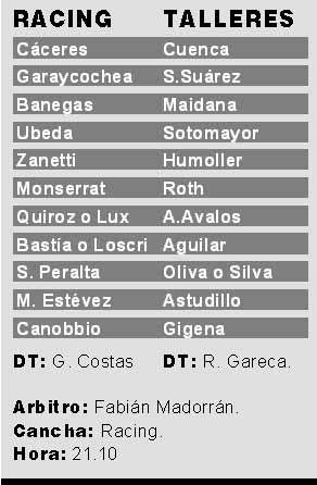 ![]() La participación de Racing en el torneo estuvo en duda hasta el último martes, cuando la Cámara de Apelaciones de La Plata postergó su decisión sobre la continuidad o no del club, que ya no correría peligro de cierre luego de que el ex presidente Daniel Lalín le comprara al ex síndico Pérez Díaz la deuda de 200 mil dólares que la institución mantenía con él. Además, la Academia volvió a vivir una semana convulsionada en el marco de la peligrosa relación entre el plantel y los violentos barrabravas. En lo estrictamente futbolístico, Costas aguardará hasta último momento la evolución de Quiroz y Bastía. Si no puedan estar, Javier Lux reemplazará a Quiroz y Loscri, a Bastía. Los dos refuerzos incorporados por Racing, Carlos Cordone irá al banco y el defensor Alejandro Simionato esperará hasta lograr mejor forma.En Talleres, por su parte, Gareca recibió a mitad de semana una grata noticia: el delantero Rodrigo Astudillo seguirá en el club, tras los intentos frustrados, primero de Francia y después de River y San Lorenzo, por contratarlo. Es muy probable que esta noche Nicolás Oliva, quien atraviesa un muy buen momento futbolístico, ingrese en lugar de Silva.