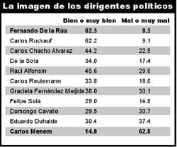 El final de gobierno de Carlos Menem todavía le arde a la mayoría: apenas un 14 por ciento tuvo algo bueno que decir de él, y su imagen negativa es del 62 por ciento. La misma cifra que aprueba a De la Rúa. |