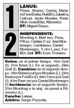 balance, Lanús fue algo más durante ese primer tramo.En el segundo, Lanús no apretó en el medio de igual manera e Independiente, mejorado en el fondo y con buena tarea de Víctor López y algunas cosas de Forlán, prevaleció. Una vez conseguida la diferencia -después de un lateral desde la derecha que peinó Forlán, Graf convirtió en el segundo palo– los de Trossero se echaron atrás y aguantaron el resultado. Pudo ser empate en un par de llegadas de Klimowicz y en el penal que le atajó brillante Mondragón arriba. Pero fue de los rojos esta vez.