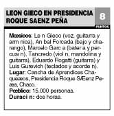 todos. El show que Sáenz Peña nunca olvidará fue un repaso de toda la historia del hombre de Cañada Rosquín, con viejos y entrañables temas como "Hombres de hierro", "La Navidad de Luis", "Todos los caballos blancos", "Carito", "Pensar en nada" y "La cultura es la sonrisa". Hubo ovaciones, sapucays y baile cuando León hizo "Cachito, campeón de Corrientes" y "Kilómetro 11". Gieco se fue del escenario después de una notable versión de "Ojo con los Orozco" ("Dársela a Pinochet", repitió), pero volvió para hacer "El embudo" a puro hard rock, con sus plomos como cantantes invitados. El final no podía ser otro que "Sólo le pido a Dios", que cobró nuevo sentido con las dedicatorias del cantante para las Madres y Abuelas de Plaza de Mayo, para quienes trabajan por la paz, para los caídos en las Malvinas, los zapatistas y los desaparecidos. Gieco, respetado por los folkloristas y casi un patriarca del rock, cantor de pueblos e incansable luchador por los derechos humanos, es uno de los pocos que pueden decir cosas así desde un escenario sin parecer una caricatura seudorrevolucionaria.