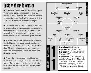 Por Ariel Greco La mejor manera de definir a este San Lorenzo es decir que es un equipo práctico. Es muy difícil que luzca aun ante un equipo débil, pero también es improbable que sea desbordado por algún rival. Por eso, sus mayores virtudes están más ligadas a las matemáticas que al juego, a los números por encima de las gambetas. A pesar de no haber rendido del todo bien en ninguno de los tres partidos del Clausura, San Lorenzo está puntero con siete puntos sobre nueve posibles. El gol que le convirtió ayer Messera fue el primero que recibió en el torneo, aunque todavía sigue ostentando la valla menos vencida. Supo exprimir al máximo sus posibilidades, ya que cada uno de los tres tantos que logró (los tres de Ariel López) se tradujo directamente en puntos. Lo curioso es que es uno de los punteros, pero en goles a favor apenas supera a Estudiantes, Chacarita, Ferro, Instituto y Gimnasia de Jujuy, no casualmente los cinco últimos del campeonato. Y paradójicamente el análisis de su juego se puede trasladar a las ciencias exactas. Para defender, el equipo de Ruggeri resta gente del medio y multiplica el esfuerzo de sus jugadores. Si bien el esquema original indica que se para con tres defensores, la realidad exhibida ante Gimnasia refleja que marca con cinco, y hasta con seis. Como le costó conseguir la pelota ya que la escondieron los volantes platenses, Adrián González y Ervitti fueron más marcadores de punta que mediocampistas y Michelini debió pegar la espalda contra los centrales. Así lo que suponían ser dos líneas de tres, por obligación se convirtieron en una de cinco con Michelini muy cerca de ellos. Por eso no fue extraño que Ruggeri rearmara todo el sistema en el entretiempo, volviera a un clásico 4-3-1-2 para emparejar en el medio, y se decidiera por la lucha de Netto en lugar de la ayer apagada claridad de Romagnoli. Tampoco se alejó de las matemáticas para atacar. La idea principal fue dividir. Cualquiera de los del fondo o de la mitad de la cancha que tomó la pelota la revoleó a campo de Gimnasia, aunque más no sea para ir a pelear el rebote. Ni hablar si alguno de los pelotazos a cualquier parte derivaba en una acción de peligro. Así atacó San Lorenzo y de esa forma llegó al gol. López, que se siente muy cómodo en el sistema ya que no es necesario aportar claridad, peleó dos veces ante Cufré y ante Hernando, se llevó la pelota de rebote y tocó con el arco vacío. La otra chance más clara fue parecida. Netto se sacó de encima la pelota con un remate desde treinta metros, el tiro se desvió en un defensor y le cayó otra vez a López, que esta vez falló apenas en la definición. Una muestra clara de lo que fue el partido se dio en una jugada cerca del final del primer tiempo. Gimnasia recién había empatado y seguía manejando mucho mejor la pelota. Gómez fue a presionar bien arriba y tocó para Sánchez. Ante el “ole” de toda la hinchada visitante, el ex volante de Central hizo una doble pared con Messera, pero el último caño quedó en los pies de Ameli, que restó como pudo, pero el balón le quedó a Ervitti. La respuesta de la gente de San Lorenzo no se hizo esperar. Ante el toque del marplatense, el “ole” de venganza bajó desde la popular local. Lástima que el pase siguiente terminó en un lateral para Gimnasia. El lugar común de “no pueden dar dos pases seguidos” se cumplía a la perfección. Aunque San Lorenzo lo buscó más, ninguno pudo sacar grandes diferencias. Los dos sacaron un punto que les permite seguir en la cima, aunque difícilmente con lo que mostraron ayer la puedan mantener por mucho tiempo.