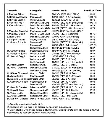 nobles y en buena ley es capaz de sacudirle el escepticismo. Es que en otros tiempos, ser campeón del mundo era sinónimo de ser el mejor del mundo. Pascualito, Monzón, Galíndez, Laciar y Julio César Vásquez por ejemplo, fueron sin duda, los mejores de su categoría en el lapso que les tocó reinar. Aquello que hoy no existe más: boxeadores capaces de garantizar triunfos donde fuera. De cinco años a esta parte, en cambio, sólo ha habido frágiles campeones de ocasión que pasaron de largo sin haber hecho historia y a veces, sin siquiera haber ganado la pelea de su consagración (Juan Domingo Córdoba, Hugo Soto y Víctor Godoi). O como Barrios y ahora Matteoni, campeones de versiones menores que tienen por encima, campeones indiscutiblemente mejores que ellos. Barrios lo sabe y por eso le apunta en mayo al título liviano de la FIB en el primer paso de una escalada hacia destinos más ambiciosos. Matteoni, desde ayer, también lo sabe. Pero no puede hacer nada. El almanaque le juega en contra y además, Jones y Michalczewski le son inaccesibles. Por eso tendrá que conformarse con lo que tiene entre sus manos: un premio consuelo, el título de la UMB. Quizá lo único a lo que puede aspirar el boxeo argentino así como está.