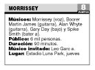 Mozzer con dedicación de exégetas.El show se basó en el concepto de Vauxhall and I, un disco de 1994 que presentaba a Morrissey más cerca de Dean Martin que de Joe Strummer. Y si bien la banda con que llegó a Buenos Aires parece un combinado de modelos rockabilly, directamente extrapolados de un casting para una película de John Travolta en plena fiebre disco, el autor de Viva Hate sigue desarrollando su papel de crooner. “Billy Bud”, “Now my heart is full”, “The more you ignore me, the closer I get” y “I am hated for loving”, todas de Vauxhall..., marcaron el camino. Morrissey regalaba al público sus remeras de un boys club y se las cambiaba por otras idénticas una y otra vez, mientras la lluvia de gladiolos no menguaba. Los émulos locales del manchesteriano, con lentes de montura negra como los que usaba en los ochenta y tenaces jopos altos, resaltaban entre un público mayoritariamente treintañero, sobreviviente de los ochenta. Muy pocos adolescentes en el Luna, chicos que heredaron los discos de sus hermanos mayores o que conocieron a los Smiths gracias a los elogios públicos de las estrellas del brit pop. “Venimos de un lugar llamado Stinkland (algo así como Tierra apestosa)... eh, digo England”, se presentó el hombre en una de las primeras muestras de su acidez. Se paseaba por el escenario con la naturalidad con que debe andar por su mansión en Los Angeles (donde se mudó hace poco), bromeaba con los seguidores que lograban acceder al escenario y abrazarlo y les extendía la mano a los de primera fila, perfectamente consciente de que no olvidarían el gesto jamás. De los Smiths cantó cuatro temas. Primero fue una versión un poco anoréxica de “Half a person”, un tema del primer disco de la banda. Después la balada “Last night I dreamt that somebody loved me”, del último álbum (Strangeways, here we come). “Un día su cuerpo tomará una decisión importante, y ojalá esta canción ayude”, pronunció antes de “Meat is murder”, que habla en tono de catástrofe sobre el “crimen” de comer carne animal. La voz de Morrissey no decepcionó en ningún momento, y si bien la suma de las guitarras de Boorer Martin James y Alan White da como resultado una copia anémica de Johnny Marr, lo único que verdaderamente importa es la figura del cantante. Y las canciones, claro. “Ouija Board, ouija Board”, “Break up the family” y “November spawned a monster” fueron tres de los mejores momentos de la performance. “Shoplifters of the world unite”, con un estribillo que exhorta a los rateros del mundo a unirse, cerró la hora y media de concierto. Fue el único bis, un tema de los Smiths con que el poeta decidió cerrar la velada. A esa altura se había cambiado la remera de West Ham por un traje que parecía de cuero. “Esto no es cuero, esto es plástico”, se apuró en aclarar él, vegetariano y defensor de los derechos de los animales. “Yo soy de plástico. ¡Los amo, nos vemos dentro de 25 años!”, se despidió sin más excusas. Los músicos siguieron con el epílogo instrumental de la última canción, pero ya no le importaba a nadie. Morrissey había abandonado el escenario y no volvería nunca más. Se prendieron las luces, empezó a sonar “My Way” en versión Frank Sinatra y la cosa quedó ahí. Hasta dentro de 25 años.