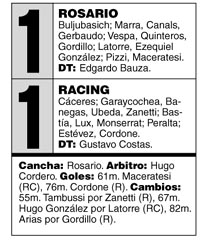 ![]() El doble enganche Latorre-González daba idea de que allí se generaría juego de la noche. A eso Central le agrega la tendencia a jugar por abajo y desconfiar del pelotazo. Sin embargo, cuando no funcionan las individualidades, Central no tiene variantes, se equivoca, se confunde y queda preso de un rival inferior que sale a la cancha tras una semana previa plagada de incertidumbre y un futuro negro, pero se repone y se la juega. El pecado de Central fue olvidarse de las puntas, de no buscar el desborde. Vespa nunca pudo con la escalera que le formaban Monserrat y Zanetti en las pocas veces que intentó llegar al fondo. Cansado del fracaso, se limitó a tirar pelotazos frontales y ollazos buscando la cabeza de Pizzi. Del otro lado Gordillo se animó poco a llegar a la altura del área. Y como Latorre-González, en noche floja, además siempre fueron para adentro y nunca para afuera, Central se encerró solo. La paradoja fue que todo debía pasar por Pizzi cuando debería ser el delantero el que dé la definición, el último toque, no el primero. Tras el cimbronazo inicial en que padeció dos llegadas claras –Latorre la tiró arriba, Pizzi cabeceó afuera– Racing se recompuso a partir de los diez minutos. Pero tampoco tuvo profundidad. Su problema era al revés que el de Central. Buscaba por afuera vía Estévez o Cordone pero después no tenía peso por adentro porque Peralta no llegaba al área y los volantes no llegaban. Sin embargo, con la lucha que plantean Bastía-Lux en el medio, con la reciedumbre de Ubeda, Racing empezó a ponerse de pie y a darle la pelota a Peralta que ahí sí, hasta los tres cuartos, creaba lo mejor. Luego, los avances no llegaban a convertirse en ataques. Racing tuvo jugada de gol sobre los 37 cuando sorprendió al fondo local mano a mano de tres contra tres y Cordone punteó al arco. Superado Buljubasich, Marra salvó de palomita casi en la línea. El primer tiempo había sido parejo en el juego aunque con más llegadas de Central que tuvo las dos más claras en los últimos dos minutos. Una fue porque se resbaló Banegas y le quedó a Pizzi que, sorprendido por el regalo, no llegó a acomodarse antes de que lo taparan. Y la otra fue un pase de pecho de Pizzi a Latorre que remató de volea y tapó muy bien Cáceres. Sólo dos desbordes tuvo Central en toda la noche. Primero avisó Marra, enseguida se fue Latorre del otro lado, la bajó Pizzi y cabeceó Maceratesi al gol. Después volvió a la normalidad, con un agravante. Racing se fue decidido a buscar el empate y comenzó a desnudar las fallas del fondo rosarino que en el primer tiempo se habían vislumbrado. Buljubasich tapó tres mano a mano (Peralta, Estévez y Cordone) hasta que fue vencido por un tiro bombeado de Cordone. Con el 1-1 los dos abandonaron los prejuicios y fueron a buscar el desequilibrio. También se profundizaron los problemas defensivos y el gol rondó los dos arcos hasta el último minuto.