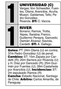 Mejoró el equipo chileno y aunque no creó peligro inmediato sí consiguió el control de pelota. Cuando nada lo hacía esperar, una mandada de Arancibia por derecha terminó en un intento forzado de pasar entre Trotta y Yepes, la caída y la sanción de supuesta infracción del colombiano de River. Convirtió Pedro González a la derecha de Bonano. Y allí vinieron los mejores momentos de la Universidad y del período. Primero Rivarola de cabeza exigió al arquero de River en su mejor atajada y, sobre el final, Amarilla le anuló un gol a Cardetti en offside dudoso.