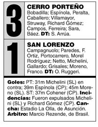 En la noche de Asunción se sumaron la depresiva sensación colectiva fruto de la penosa experiencia vivida por el grupo ante el suicidio de Mirko Saric –la dirigencia paraguaya se negó a postergar 24 horas el partido– con un clima hostil que se manifestó dentro y fuera de la cancha. En cuanto al juego, el planteo ultraconservador que se propuso Ruggeri no dio resultados. Sobre el final del primer tiempo los paraguayos se pusieron dos goles arriba y sólo el descuento de Moreno –no había ningún delantero neto en el planteo inicial– abrió una esperanza. Sobre el final, faltando menos de diez minutos, la tercera conquista de Cerro Porteño apagó la última luz. A San Lorenzo le espera, al regreso, el partido con Boca del domingo. Es el puntero y debe defender esa posición. Una semana terrible.