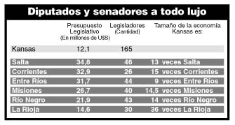 Otros ejemplos confirman la apetitosa “crema” que existe en los legislativos locales. Los Congresos de Salta (46 legisladores) y Corrientes (39 legisladores) casi triplican los fondos del poder legislativo de Kansas (165 legisladores), un estado varias decenas de veces más rico. Más precisamente, Kansas es 13 veces Salta y 15 veces Corrientes (ver cuadro).
