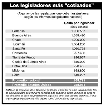 Un legislador de Formosa “cuesta” al Estado 1,9 millones de pesos al año. Uno de Buenos Aires, casi 1,4 millones. Uno del Chaco, 1,2 millones. Uno de Santa Fe, Tucumán y Corrientes, alrededor de 1 millón de pesos. En la ciudad de Buenos Aires, unos 810 mil al año. El promedio de gasto por cada legislador a nivel nacional es de 655 mil pesos. En cambio, el promedio de gasto por legislador en Estados Unidos es de 360 mil dólares (ver cuadro).