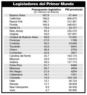 Dejando de lado a Texas, la región de los magnates petroleros, no hay legislatura estatal en Estados Unidos con un presupuesto tan alto como el que financian los habitantes de Buenos Aires. El Parlamento bonaerense es más caro que el de California o el de Nueva York, los dos estados norteamericanos más ricos, con un producto bruto 8 y 5 veces mayor, respectivamente, al de Buenos Aires.