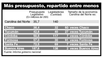 La legislaturas de Chaco, Formosa y Tucumán, unicamerales con 30 a 40 diputados, tienen un presupuesto bastante superior al Congreso del estado norteamericano de Carolina del Norte, bicameral, con 98 diputados y 42 senadores, y que no es ni por asomo de los más “baratos” de ese país. En las tres provincias norteñas casi la mitad de la población vive con ingresos comparables con Africa, pero los políticos manejan presupuestos insólitos para la realidad que gobiernan: Carolina del Norte es 91 veces la economía de Formosa, 60 veces Chaco y 27 veces Tucumán. Página/12 tuvo acceso a los informes del gobierno nacional que demuestran cómo se financia en el interior el clientelismo político a través de las instituciones del Estado. En Buenos Aires, los senadores cobran sueldos más altos que los ministros nacionales, pero además pueden nombrar 30 “asesores” con un sueldo de mil pesos cada uno. Lo mismo en Corrientes. En la Ciudad de Buenos Aires, los legisladores pueden designar 15 asesores de mil pesos mensuales y uno de 1800 pesos. En Misiones se fijaron por ley “gastos de función política” millonarios, “sin rendición de cuenta de ninguna índole”. En Santa Fe cobran 10 mil pesos y otro tanto en “subsidios” para pagarle a su territorio político. Y sigue la lista.