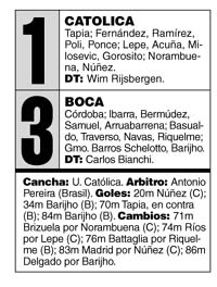 ![]() Boca salió con su clásica postura para los partidos de visitante en la Copa: a la retranca. Con los volantes contenidos y los marcadores de punta dedicados a la función defensiva, las posibilidades de Boca se limitaron a lo que podía generar Riquelme. Para colmo, Barijho y Barros Schelotto se comieron todos los anzuelos que tiró el fondo de la Católica cuando daba el paso adelante y quedaron casi siempre en posición adelantada. Claro que comparado con la tibieza del equipo chileno, la sensación que quedaba es que si Boca aceleraba el ritmo, no tendría inconvenientes en llevarse la victoria. Pero como el equipo de Bianchi tardó en entenderlo, llegó la sorpresa. Cuando Córdoba no había pasado ningún sobresalto y las chances más claras habían sido para Boca, llegó el bombazo de Núñez que puso el injusto 1-0. Más allá del golpe inicial, el tanto de la Católica fue lo mejor que le pudo pasar a Boca. Obligados por el resultado, los visitantes se adelantaron en el terreno y empezaron a forzar el desarrollo. Primero lo tuvo Basualdo, pero remató débil. Y en la mejor maniobra colectiva del primer tiempo llegó el empate. Combinaron Traverso, Ibarra y el Mellizo, el volante mandó un centro de primera que cabeceó con precisión Barijho. Consciente de que si atacaba se llevaba la victoria, Boca arrancó con mayor decisión la segunda parte. Además se dio cuenta de que con la llegada de los volantes o la subida por afuera de los laterales podía romper el fuera de juego que intentaban los chilenos. De esa manera lo perdieron Riquelme y Navas, pero la insistencia rindió sus frutos. Luego de un corner del Mellizo, un frentazo de Bermúdez fue rechazado en la línea pero rebotó en la espalda de Tapia y se metió. El gol terminó de tranquilizar a Boca, que se dedicó a cuidar la pelota y lo definió de contra. Con poquito le alcanzó para llevarse de Chile lo que fue a buscar.