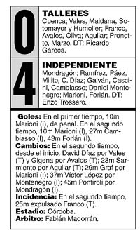 Independiente goleó a Talleres de Córdoba por 4-0 y se acercó a los líderes, en un encuentro adelantado de la décima fecha del Clausura. El conjunto de Avellaneda, que marcó sus goles por intermedio de Bruno Marioni, en dos ocasiones –uno de penal–, Esteban Cambiasso y Diego Forlán, llegó a las 16 unidades, dos menos que los líderes Boca y River, que tienen dos partidos menos y juegan hoy.