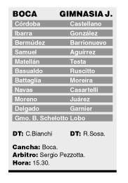 Quedaron excluidos Cristian Traverso, quien padece un principio de pubialgia; Juan Román Riquelme, por una molestia en el tobillo derecho; y Rodolfo Arruabarrena, afectado por una fatiga muscular. El técnico descartó que la exclusión de Riquelme y Arruabarrena se trate de “una actitud especulativa”, a pesar de que ambos jugadores tienen cuatro amarillas, y de obtener una más no podrían jugar el partido del domingo 30 ante River. Sobre los jujeños, Bianchi opinó ayer que el trámite no será fácil, ya que este rival buscará frente a Boca la revancha por la derrota del pasado lunes con River por 2 a 0. Con la intención de sumar puntos, que mejoren su crítica situación deportiva, el técnico Raúl Sosa dispondría varios cambios en la formación titular: los ingresos de Carmelo Ruscitto, José Moreira, Fernando Casartelli y Carlos Garnier por José Almaraz, Claudio Rivadero, Marcelo Herrera y David Nazareno Bisconti. Un dato a tener en cuenta es que en lo que va de la temporada, Gimnasia no pudo ganar un partido como visitante. Por el lado de Boca, la novedad será la vuelta al primer equipo del mellizo Gustavo Barros Schelotto, quien tras recuperarse de un desgarro en el muslo derecho jugó algunos partidos en reserva y hoy integra el banco de suplentes junto a Abbondancieri, Burdisso, Marchant y Barijho.