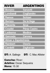 “Aimar tiene un esguince de tobillo izquierdo; hoy le hicimos una radiografía y, aparentemente, no es una lesión de gravedad”, dijo anoche el médico del plantel, Luis Seveso. Por su parte, Angel –quien continúa recuperándose de una distensión en el isquiotibial izquierdo– expresó que todavía siente dolor en la pierna. Aimar realizó un trabajo diferenciado, a las órdenes del kinesiólogo Jorge Bombiccino, en el estadio Monumental, donde se entrenó el plantel. En tanto, Angel participó del ensayo de fútbol reducido que ordenó el entrenador Américo Gallego. La formación no está decidida, de modo que la que aquí se entrega es tentativa. Gallego recién confirmará a los once momentos antes del partido. “Si Aimar se siente bien jugará, si no entrará Zapata y Angel posiblemente vaya al banco”, dijo anoche Gallego. Tras el partido, los colombianos Yepes y Angel viajarán a La Paz para unirse a su selección que en la semana enfrentará a Bolivia por las eliminatorias. Argentinos cumple la peor campaña de los últimos años. Está penúltimo con sólo 5 puntos, 2 menos que Ferro y 3 más que el último Gimnasia de Jujuy. Este año llegó a perder 8-1 con Independiente y en la última fecha cayó ante Unión en Santa Fe por 2-1. Además produjo el recambio del técnico. Mac Allister es interino pero los dirigentes le ofrecieron continuidad. El ex lateral la aceptaría si su contrato se extiende a junio del 2001.