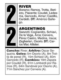 Si bien se imaginaba que River saldría más decidido en la segunda etapa, Argentinos tuvo las mejores oportunidades: primero Bonano le ganó un mano a mano a Insúa, y a los 31 minutos Zagharian se perdió lo que hubiera sido el triunfo al pegarle de zurda al lado del palo. Antes, a los 15, Gancedo había alcanzado la igualdad de media vuelta, luego de que Aimar bajara con la cabeza un centro desde la izquierda. Desde allí hasta el final, River volvió a recurrir a los pelotazos desde el fondo (Schiavi ganó siempre de arriba) y ni siquiera el ingreso del colombiano Angel por Castillo (se fue silbado por todo el estadio) pudo revertir su tarde más difícil.