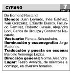 Por Cecilia Hopkins En Buenos Aires, Cyrano vuelve a escena cíclicamente: fue el último personaje que interpretó Ernesto Bianco a fines de los setenta, y en los noventa fue el inspirador de dos versiones destinadas a un público joven, una, dirigida por Claudio Hochman, la otra, por Manuel González Gil y protagonizada por Hugo Arana. La versión que se estrenó en el Teatro Avenida está basada en la adaptación cinematográfica que hicieron JeanClaude Carrière y Jean Paul Rappeneau para lucimiento de Gérard Depardieu. No bien hace su aparición el Cyrano que interpreta Juan Leyrado, pasan desapercibidos los personajes que a su alrededor ensayan comportamientos cortesanos convencionales. Su interpretación burlesca y temperamental diluye cualquier posibilidad de establecer parentescos entre este personaje y los roles que la televisión hizo famosos. Su presencia en escena es decisiva, con sus arrestos histriónicos, su voz enérgica y la mirada desafiante que escudriña la platea, acierto de la dirección de Norma Aleandro. Porque si bien Inés Estévez aporta un trabajo correcto, apenas Leyrado abandona el escenario, queda al descubierto el módico atractivo de la pieza y de las intervenciones del elenco restante. En el rol de Cristian, Iván González sólo convence mientras cuenta con el respaldo que le brinda la presencia del protagonista. La escenografía es sencilla y funcional; la música y el vestuario, previsibles. La iluminación, en cambio, aporta un signo distintivo a una puesta que resulta ingenua al resolver las escenas de batalla: la proyección de las sombras de unos pocos espadachines ilustran el asedio, moviéndose sobre una banda sonora que deja oír gritos, relinchos y cañonazos lejanos.