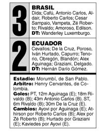 Con una actuación poco convincente, Brasil derrotó a Ecuador y conquistó su primera victoria en las eliminatorias pese a que no logró entusiasmar a la multitudinaria hinchada que colmó el estadio Morumbí, y se fue silbado. Rivaldo confirmó su talento y capacidad de goleo, pero el equipo no alcanzó para conformar.