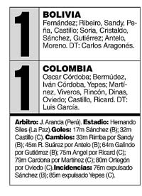![]() Erwin Sánchez, luego expulsado, de tiro libre, y Jairo Castillo marcaron los goles, mientras que Mario Yepes también vio la tarjeta roja. Bolivia presionó durante los primeros minutos, pero fracasó en la elaboración de las jugadas de ataque, a pesar de los buenos intentos de Platini Sánchez, el jugador que más inquietó con sus remates desde lejos y que protagonizó un espectacular duelo con Oscar Córdoba. De esa manera, Bolivia consiguió la ventaja con un preciso tiro libre de Sánchez, que el arquero de Boca no pudo controlar. Colombia abandonó su actitud especulativa y se adelantó en el terreno. Así dispuso de varias ocasiones para empatar, aunque el árbitro Aranda anuló de manera equivocada un gol de Jairo Castillo por posición adelantada. Sin embargo, el delantero del América tuvo su revancha cuando aprovechó una desinteligencia entre Sandy y el arquero Fernández. En el complemento, Bolivia intentó con mayor vocación ofensiva, pero en todos las ocasiones murió en la seguridad de Córdoba. Hasta que apareció la violencia, y Aranda miró para otro lado.