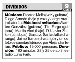 Por Roque Casciero También fue un show histórico por la puesta en escena, con láseres que se disparaban como rayos, dibujaban o creaban una especie de virtual túnel de luz, y pantallas en el fondo de la escena que se usaron para un imaginativo trabajo de seguimiento individual del trío. El escenario tenía dos niveles: adelante estaban Mollo y su guitarra, Diego Arnedo y su bajo, y baterías a ambos costados, para que Jorge Araujo se sentara a placer o permitir la presencia de algún invitado; atrás estaban, por momentos, el DJ o las cuerdas lideradas por Alejandro Terán (Pericos, Soda Stereo, La Portuaria).Y, finalmente, fue histórico por lo más importante: la música. Cualquiera que conozca a Divididos sabe que sus integrantes son grandes instrumentistas y destacarlo, a esta altura, sería redundante. Sin embargo, el trío superó cualquier concierto anterior con una performance memorable. Durante tres horas, presentó todos los temas de su último álbum y repasó viejas y gloriosas páginas de su historia: “Azulejo”, “Qué tal”, “Paraguay”, “El 38”, “Aladelta” y las versiones de “Voodoo chile”, “El arriero” y “Cielito lindo”. El final fue con el tradicional popurrí de canciones de Sumo (“El ojo blindado”, “Estallando desde el océano”, “Mejor no hablar de ciertas cosas”, “No duermas” y “Mañana en el Abasto”). Pasado, presente y la intuición del futuro de Divididos en una sola noche. Uno de los picos del show fue “Qué ves”, esa sutil cruza de reggae, rock y folklore que brilló en La era de la boludez, el disco más exitoso del trío. Para la ocasión, Divididos contó con un invitado distinto cada noche, aunque con el mismo arreglo para charango. El viernes estuvo Gustavo Santaolalla, productor de aquel exitoso disco, y el sábado, Jaime Torres, a quien Mollo presentó como “nuestro Jimi Hendrix”. Pero lo más emotivo fue “Par mil”, la canción con destino de hit que Mollo le compuso a su amor. “Luz, luz, luz del alba/ Soy un hombre que espera el alma”, canta allí el guitarrista con cierto dolor en la voz. En el alma de su banda, en cambio, parecen haber sanado todas las antiguas heridas.