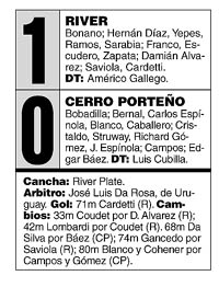 El primer tiempo fue muy flojo. Cerro Porteño no vino predispuesto para la hazaña de revertir los números sino a aguantar el resultado con siete atrás y el resto a media agua. River puso todos los suplentes y, aunque la predisposición pudo haber sido la misma, la aptitud no lo era. Así, todo fue aburrido y en el medio. El único seudointerés, y en forma intermitente, radicó en los cambios sucesivos que debió encarar Gallego: primero sacó a Damián Alvarez por lesión –le pegó feo Struway– y puso a Coudet; antes de que el Chacho cumpliera diez minutos en la cancha, lo sacó para poner a Lombardi. Otra vez por lesión. Eso fue lo más entretenido, la anécdota. Porque en cuanto a lo estrictamente futbolístico –goles y buenas jugadas, nada– todo se acabó tras el inicio electrizante en que River, vía Zapata, que picó al vacío de izquierda al corazón del área y llegó a situación de gol dos veces. Y nunca más. Los paraguayos, ordenados, duros, mezquinos, sólo llegaron una vez a través de una trepada de Cristaldo por izquierda que tapó Bonano. Y nada más.