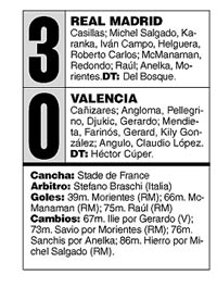 La cara de Héctor Cúper después del partido era de pocos amigos. El entrenador argentino de Valencia confesó que estaba “desconsolado” porque llegar a una final “significa que uno quiere ganarla”. Y el Valencia la perdió. Ambos entrenadores sacaron las mismas conclusiones: Cúper reconoció que el Madrid había sido “superior”, mientras que Vicente del Bosque declaró con orgullo que los merengues habían “controlado el partido de una punta a la otra”. Prueba del análisis de ambos entrenadores es la actitud de las tribunas. Los españoles no sabían muy bien qué festejar. Los madrileños aplaudían tímidamente, mientras que todo el sector anaranjado del estadio estaba sumido en un profundo silencio. Un joven valenciana con la cara maquillada de anaranjado lloraba diciendo: “Los madrileños son como los paraguas. Siempre caen de punta”.