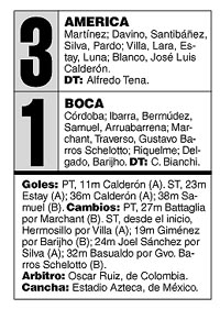 ![]() Apareció más decidido el América de salida, con los argumentos habituales de control de pelota y mucha participación colectiva con la conducción de Estay y la proyección ofensiva sobre todo por izquierda, donde Blanco se juntaba con la subida de Luna. Y además, el otro rasgo determinante de los primeros minutos fue la rudeza en la marca de los hombres mexicanos. El golpe de Pavel Pardo a los dos minutos a Riquelme fue amarilla por no ser roja directa; al rato, la “venganza” de Bermúdez sobre Blanco mereció la misma tarjeta. Enseguida, aunque la supremacía del América no se manifestaba en oportunidades claras, la posición cautelosa de Boca, que no apretaba en el medio y retrocedía hasta verse obligado a derribar a los rivales cerca del área, generaba posiciones de pelota parada siempre complicantes: tiros libres y corners. Precisamente con uno de ellos se originó, apenas pasados los diez iniciales, el primer gol del América: el corner desde la izquierda fue peinado en el primer palo y Calderón, en el segundo, le ganó a su marcador Arruabarrena y a Córdoba en la raya: 1-0 y un panorama complicado para Boca. No lo fue tanto, en realidad. Con la entrada de Battaglia por Marchant lesionado –aunque el cambio estaba tácticamente previsto por el desarrollo–, Bianchi consiguió neutralizar la movilidad de Luna, sobre todo porque en Ibarra tuvo a una de las figuras más firmes del fondo, ocupándose de Blanco y cerrándose sobre el medio y anticipando cuando era necesario. Pero Boca nunca se planteó atacar armónicamente. Optó por darle la pelota a Riquelme para que habilitara a los de arriba, pero no hubo compañía. Así, una vez Barijho y otra Arruabarrena no llegaron por poco; pero los mexicanos fueron más contundentes, sobre todo a través de dos vías: de afuera –remates de Villa y de Estay– y por arriba, con centros que obligaron al esfuerzo reiterado de Córdoba. Mejoró Boca en el arranque del segundo. Se paró un poco más adelante, manejó la pelota y durante los primeros veinte tuvo un par de llegadas claras: primero fue una doble aproximación, que tras el cabezazo de Samuel siguió con toque de Delgado que salvó Martínez en ambas oportunidades; y después, Barijho, en la última jugada antes de salir. Pero poco más o menos, ahí terminó todo. Porque bastó que Boca perdiera el control de pelota y el manejo del trámite para que el América convirtiera. Tras buena jugada de Calderón, su centro atrás fue recibido por Estay que la colocó a la izquierda de Córdoba. Fue un punto de fractura en el desarrollo: América creció,impulsado por Calderón-Estay, con Hermosillo y Blanco más arriba y las subidas de Pardo. Y Boca no aguantó la presión. Tras un remate de Luna en el palo, el corner fue cabeceado por Calderón y gol. Faltaban menos de diez y se venía la noche. Pero la historia –o el destino– quiso que no fuera así. Boca garroneó un corner, subió Samuel y llegó justo para conectar el envío pasado de Riquelme. La pelota entró bombeada en el segundo palo y a cobrar. Nunca un 1-3 ha sido tan celebrado. Ahora se verá cómo sigue.