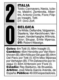 El devenir del encuentro les vino muy bien a los azules para desarrollar su juego especulativo. Se encontraron con un gol de cabeza del delantero de la Roma Francesco Totti en el minuto seis, en el que fue su primer y casi único acercamiento al arco belga en la primera parte, y el resto del tiempo se dedicaron a mantener el resultado. En la segunda parte, de nuevo en su primer ataque con peligro, Stefano Fiore anotó un gran gol con un medido tiro de media distancia tras una habilitación en pared de Inzaghi, que aguantó la marca y lo cortinó.