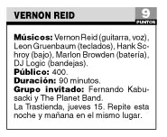 de montonera y grito destemplado frente a la escena.¿De qué armas se valió el guitarrista para ello? Primero y principal, del funky, un género que corre por sus venas con la naturalidad de quien tiene la piel oscura y el ritmo incorporado. Pero si la primera sección del show estuvo dedicada a esas bases sensuales, salvajes y precisas a la vez, que llaman a mover el cuerpo, con el correr de la noche quedó claro que Reid no se estaciona en aquello que domina con más facilidad. Y que Reid parece dominar con facilidad unas cuantas cosas. Así, hubo segmentos de música hipnótica que recordaron a esos largos pasajes instrumentales de The Doors, y arranques melancólicos de guitarra limpia, y curiosidades jazzeras en las que Vernon mutó su guitarra en un disparador de sintes, y esa atropellada final de rock sanguíneo, hendrixiano, pero a la vez multidimensional. Para sostener y expresar todo eso, el moreno demostró además estar bien rodeado. Porque su banda de apoyo resultó una curiosidad en sí misma, una rara combinación de talentos que tocaban cosas difíciles de creer todo el tiempo, obligando al espectador a la ardua tarea de tener que elegir a quién mirar. Allí estaba Jason Kibler, alias DJ Logic, un ejecutante maravilla de las bandejas que viene de trabajar con Medeski, Martin & Wood, y que dio contrapuntos y climas sorprendentes toda la noche a puro scratching. O Marlon Browden, un baterista que parecía escapado de la Jimi Hendrix Experience, con una técnica desgarbada, pero de efecto demoledor. O su compañero de base Hank Schroy, que en cada nota de su bajo parecía dejar la vida. O ese blanquito cool llamado Leon Gruenbaum, que pasaba del piano a un extraño símil de teclado de computadora con lucecitas pisteras, colgado a la altura de la cintura y capaz de emitir los sonidos más inesperados. Con ellos y con buena parte del material del único disco solista del músico, Mistaken Identity (el inicial y contagioso You say hes just a psychic friend, los demoledores Whats my name y Saint Cobain), más algún tema inédito como Kharma y esa rendición a losTalking Heads, Reid dejó claro que algunos héroes de la guitarra evitan puntualmente convertirse en bronce. Aunque tengan todo para merecerlo.