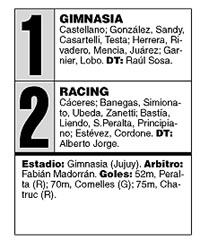 ![]() De todas maneras, aún con la victoria de anoche, el equipo que ahora dirige Alberto Jorge, pero que fue conducido por Gustavo Costas y Humberto Maschio durante 12 fechas, acumula una efectividad paupérrima: el 26 por ciento de los puntos, producto de dos triunfos, siete empates y siete derrotas. Después de un primer tiempo para olvidar, vino la apertura del marcador, tras una jugada en la que Estévez, entrando por izquierda, abrió al centro del área, por dónde entraba sólo Peralta, que no tuvo problemas para ajusticiar a Castellano. Al ratito se perdió el segundo Cordone, que pudo jugar pese a haber sido suspendido por cinco partidos por un juez contravencional, luego de festejar groseramente un gol ante Vélez, tras haber apelado la medida ante la Cámara Penal de Lomas de Zamora. Y, al cabo, cómo no podía ser de otra manera, llegó el empate: corner desde la izquierda, cabezazo de Comelles abajo, Cáceres que la pierde junto al palo. ¿Otra vez sopa? Pero cinco minutos después, tras un corner y un cabezazo de Simionato, Chatruc la clavó en el ángulo con la cabeza. Gimnasia se perdió el empate a dos del final, y Racing volvió a sumar tres puntos. Es algo, ¿no?