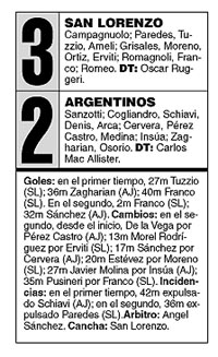 ![]() Argentinos jugó un buen primer tiempo –con algunos problemas atrás–, tocando y buscándose como en aquellos tiempos de la tradición de los bichitos colorados; jugando así hizo un gol y pudieron ser dos. Prevaleció en la primera mitad, hasta los veinte. San Lorenzo jugó un primer tiempo regular (directamente malo en el fondo), empujando más que jugando, pero con apariciones –de Tuzzio y de Romagnoli– que le permitieron, llegando menos, hacer dos goles, que pudieron ser tres. Tuvo su mejor momento después de la primera ventaja. Lo dos primeros goles fueron calcados: pelota parada, centro preciso (de Romagnoli e Insúa) y anticipo ofensivo (de Tuzzio y Zagharian). El del desnivel conjugó la sutileza del Pipi en el pase a Romeo, la falta de sutileza de éste que la cruza, medio al arco, medio centro, y el ímpetu de Franco que la toca al gol arriesgando su pierna izquierda: el golpe contra el palo fue tan violento que dio miedo verlo... Eso fue a los ‘40 y Argentinos no lo merecía. Dos minutos después lo echaron a Schiavi y todo cambió. En tres minutos. Y en cinco minutos –al sumarle los dos iniciales del segundo– todo se simplificó aún más para los de Ruggeri, porque Sanzotti salió mal y el buen centro de Grisales cayó en la cabeza libérrima del heroico Franco. Era el 3-1 y partido definido. Sin embargo, no pareció así en los minutos siguientes, cuando Osorio cabeceó bombeado al palo de Campagnuolo. Y menos todavía cuando Sánchez convirtió con otro cabezazo en parábola. Para entonces –los quince finales–, el Santo rezaba y sólo el arquero de San Lorenzo, la figura de su equipo, hacía pie en medio del desorden.