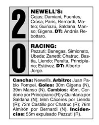 ![]() Newell’s mostró desde el inicio que estaba más decidido a buscar la victoria. Y en apenas unos pocos minutos se acercó con peligro a Pezzuti: primero con una llegada de Manso, por la derecha, pero su remate cruzó toda el área; y después con un tiro de Gigena, entrando por la izquierda, pero que también salió al lado de un palo. Enseguida, Manso volvió a rematar desde lejos y la pelota salió apenas por arriba del travesaño. A esa altura, Racing sólo pudo responder con un tiro libre ejecutado por Simionato que se fue cerca del palo derecho de Cejas. El equipo local mantenía la iniciativa del partido, y se podía percibir que en cualquier momento se pondría en ventaja. Y así sucedió. Exactamente a los 30 minutos, Gigena marcó el primero definiendo por arriba de Pezzuti, luego de una gran habilitación de Manso (imparable durante todo el partido). Y nueve minutos más tarde, el propio Manso fue el encargado de aumentar con otro toque suave. En ambos casos, los jugadores de Newell’s recibieron solos en la puerta del área, y la defensa de Racing le ofreció todas las comodidades para convertir. Racing recién creó su primera chance de gol a los 42 minutos de la primera etapa, pero Cejas le ganó el mano a mano a Estévez. Luego del descanso, Newell’s siguió dominando el encuentro y Manso seguía siendo el encargado de manejar todos los circuitos ofensivos de los rosarinos. De esa manera, las chances de aumentar aparecían. Primero lo tuvo Quintana, pero fue derribado por Pezzuti (se ganó la expulsión), y después el defensor Fuentes apareció con un cabezazo que se fue muy cerca. Racing se acercó apenas con un tiro de Bastía, sobre el final. Quizá la falta de ideas de sus jugadores tiene que ver con la incertidumbre por el futuro del club de Avellaneda. La llegada del nuevo técnico se sigue demorando porque el juez Gorostegui, a cargo de la quiebra, no está decidido a contratar a Héctor Veira, como pretende la sindicatura. Los candidatos del magistrado son la dupla integrada por Oscar López y Oscar Cavallero. Al mismo tiempo, el coordinador Agustín Cejas continúa diseñando el próximo plantel. En principio, ya tendría todo acordado para concretar la llegada del arquero Carlos Navarro Montoya. En Newell’s, no seguirán los defensores Fernando Gamboa (podría pasar a Independiente) y Raúl Cardozo.