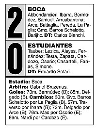 Con goles de Bermúdez y Delgado, Boca le ganó 2-0 a Estudiantes y lo dejó muy comprometido en la lucha por la promoción, en un encuentro que tuvo diferentes matices, aunque todos disociados: varios jugaron un partido aparte. La gente de Boca seguía festejando la Copa y despedía en cada pelota a Arruabarrena. El Vasco sabía que era su último partido, pero lo jugó como si fuera uno más. Por su pasado, Guillermo lo tomó de manera especial e intentó eludir todo obstáculo albirrojo que se le cruzara, sin importar cuántos. Y para los hinchas de Estudiantes el duelo con el Mellizo era casi tan importante como que su equipo atacara. En cuanto al resto, para los jugadores de Boca era un partido más, y se notaba que tenían la cabeza puesta en otra cosa. En cambio, para los visitantes era decisivo, por lo que a ellos se les notaba el miedo a perder. Sin embargo, todos esos “partidos aparte” simultáneos no alcanzaron para conformar uno que valiera la pena. Boca arrancó mejor, y en los primeros quince minutos el travesaño le negó el gol tres veces con los tiros libres de Guillermo y La Paglia, y luego en una chilena de Barijho. Pero de a poco, el equipo de Bianchi se fue desinflando hasta aburrir por su lentitud. Con ese trámite, Estudiantes se sintió cada vez más cómodo y hasta se animó con un par de contras. Cuando todo llevaba al empate, apareció la cabeza de Bermúdez para marcar el gol. Allí Boca jugó un ratito muy bien, creó varias situaciones y lo liquidó con un golazo de Delgado.