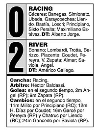 Los cambios –entraron Hernán Díaz y Garcé– hicieron que River se acomodara para esperar y Racing dispusiera un poco de la pelota. No varió el trámite sin embargo, y fue River el que tuvo más oportunidades de convertir y Simionato le tapó un remate de gol a Saviola, muy activo y preciso toda la noche. Un tiro de lejos de Bastía fue todo lo que aportó Racing en ataque. Para esto, ya la gente de River celebraba por anticipado.