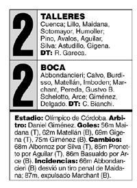 Con varios suplentes y con la herida abierta de la renuncia de Juan Román Riquelme a viajar a Córdoba, por diferencias con los dirigentes de Boca respecto del aumento de la prima que los directivos prometieron hace varios meses al jugador y aún no cumplieron, el conjunto de Carlos Bianchi consiguió empatar frente a Talleres por 2-2 en un partido que se le complicó más de lo esperado. El arquero Roberto Abbondancieri fue la figura del partido: desvió un penal y frenó la ofensiva de los cordobeses, quienes buscaban el pasaje a la Libertadores y a la Mercosur, que finalmente consiguió Vélez tras derrotar a Central. Cerrado el Clausura, Boca piensa ahora en los refuerzos: quieren a Esteban Cambiasso, pero no parece fácil, y por las dudas tratan de asegurar al chileno Rodrigo Tello. Según el dirigente Roberto Digón, la llegada del volante de la Universidad de Chile condiciona la ida del peruano José Pereda, ya que los xeneizes tienen cubierto el cupo de extranjeros.