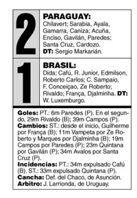 ![]() El primer tiempo de Brasil fue de lo peor que se le ha visto en mucho tiempo. El cauteloso Luxemburgo planteó un esquema que no sólo fue mezquino sino absolutamente fallido. Con un solo teórico delantero –França– y Rivaldo junto a Djalminha encargados de generar juego en el medio, apenas delante de una convención de volantes ineficaces –Sampaio, Conceiçao, Ze Roberto–, Brasil no consiguió generar una sola situación de riesgo al tranquilo Chilavert. Y, lo que es más curioso si cabe, tampoco dispuso de la pelota. Enfrente, Paraguay jugó bien. Firmes los cuatro de atrás, con Gavilán y Paredes yendo y viniendo por los costados, Enciso marcando y Acuña en la conducción. Se tiraba unos metros atrás Santa Cruz y le ganaba las espaldas a los volantes brasileños, complicando a los centrales. Arriba, el peleador Cardozo. Con eso, casi convierte a los cinco; y del corner derivado de un cierre de apuro vino el centro y Paredes cabeceó solo. 1-0 y siguió mejor Paraguay. Para colmo, algo después de la media hora se fue Cafú por llegar tarde y pegar arriba. Brasil terminó de desdibujarse y aunque Paraguay lo respetó mucho y no lo acosó, hubo que esperar hasta el minuto final para que Rivaldo colocara un tiro libre bastante lejos del palo. Eso fue todo. El segundo arrancó igual y a los diez minutos, después de casi veinte toques con ole coreado, Paraguay terminó una gran maniobra de ataque con remate de Sarabia que sacó apenas Dida. Era golazo e historia. Brasil, mientras, nada. Pero a partir de allí, el partido cambiaría. Así, después de los quince, con la entrada de Marques y Vampeta y un poco más de decisión, los de Luxemburgo arrimaron: primero un tiro libre de Rivaldo que congeló a todo el mundo y después cabezazo apenas arriba del mismo flaco. A esa altura, pasada la mitad del período, ya Paraguay esperaba y Brasil iba. Y casi empata primero Marques y a la media hora una avivada de Roberto Carlos terminó en centro que Rivaldo convirtió en palomita cambiando el palo. Y estaba bien. Pero el partido guardaba otra vuelta de tuerca. Faltaban seis y un pelotazo profundo de Chilavert, peinado (o no) por Cardozo, terminó en el borde del área rival. Campos primereó a los zagueros, la acomodó para el derechazo y de sobrepique hizo el hermoso gol de la victoria paraguaya. Después, toda la fiesta.