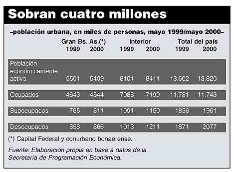 Lo cierto es que el salto del desempleo al 15,4 por ciento, desde el 14,5 de mayo de 1999, implica que hay 206 mil personas más sin trabajo que hace un año. El total de desocupados en la primera medición del gobierno de la Alianza trepó a 2.077.000. Y los subempleados, aquellos que trabajan menos de 35 horas semanales y quisieran hacerlo más, llegaron a 1.960.000. En total, las personas que tienen problemas laborales llegan a 4.037.000, una de cada tres de la población económicamente activa. Al analizar el informe presentado ayer por el INDeC, se pueden extraer las siguientes conclusiones: