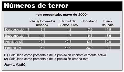 El impacto, medido en cantidad de personas, es más elocuente que los índices: 2.077.000 desocupados y 1.961.000 subocupados. El interior, en su conjunto, registra más de 1.200.000 desocupados, un nivel que no había alcanzado ni siquiera en los picos de desempleo de 1995. Son nada más que los que manifiestan “abiertamente” sus problemas de empleo ante las encuestas del Indec, la que no registra a los desalentados que ya no salen a buscar trabajo o a quienes se “ocupan” en la venta callejera de cualquier tipo de baratijas, o buscan “changas” por día u hora en tareas mal remuneradas. El gobierno nacional está recogiendo los efectos de un fenómeno estructural que barrió, a lo largo de diez años de menemismo, con el empleo formal y el desarrollo de cordones industriales y economías regionales. Pero también es reflejo de una opción de política económica asumida por la Alianza desde que tomó a su cargo la conducción del país: privilegiar el ajuste fiscal, una reforma impositiva que golpeó a la remuneración del trabajo antes que a las rentas especulativas y mantener la confianza en que la mejora en los resultados macroeconómicos provendría de la acción del mercado.