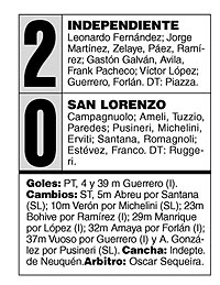 Independiente sacó ventajas justas pero acaso excesivas a través del recuperado Guerrero –se fue muy aplaudido al final– en dos jugadas del primer tiempo en que la defensa de San Lorenzo se equivocó. A los 5 minutos, Guerrero convirtió como consecuencia de una serie de rebotes que se originaron tras un centro del uruguayo Víctor López y una salida deficiente de Gustavo Campagnuolo. A los 39, nuevamente Guerrero dominó con el pecho entre los dos marcadores centrales de San Lorenzo una pelota colocada por Leandro Avila con precisión –pero desde muy lejos– y fusiló a Campagnuolo.