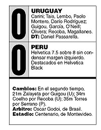 El Uruguay de Passarella se quedó sin el puntaje idea como local en su sexto partido de las eliminatorias. Ahora, con este empate tiene 11 puntos, mientras que el equipo de Pacho Maturana, que se fue conforme del Centenario, llegó a los 5 y no tiene de qué quejarse. Un Perú muy mezquino, que sólo llegó con cierto riesgo a los 37 minutos del segundo tiempo con un pelotazo de Pizarro desde afuera en un contraataque aisladísimo, sólo atinó a defenderse sin prolijidad. Uruguay atacó –o avanzó, más precisamente– durante todo el partido, pero se excedió en la centralización y los centros frontales.