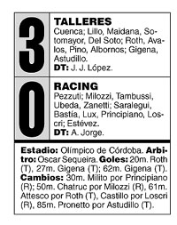 Talleres se paró mejor en el campo y fue atacando por los costados y con mucha más profundidad que los de Avellaneda. Así, en menos de 5 minutos se puso 2-0 arriba. El primero de los cordobeses llegó luego de un centro de Pino que Roth conectó de cabeza ganándole a Loscri en la altura. El segundo fue de penal. La jugada se originó en un tiro de esquina. El árbitro Oscar Sequeira cobró un dudoso agarrón de Ubeda sobre Maidana en el área chica. El disparo lo hizo Gigena –pese a convertir, debió ejecutar nuevamente el tiro por invasión de Maidana–, el delantero la colocó suave sobre el palo izquierdo de Pezutti. Con el marcador en contra, Racing repuso un poco su actitud y logró atrasar en la cancha a Talleres, aunque sin generar mucho peligro.