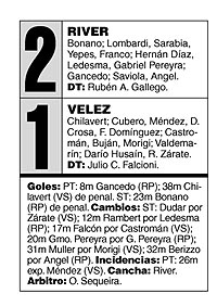 El trabajo del luego substituido Rolando Zárate y las proyecciones de Castromán y Federico Domínguez –Vélez jugó sin enganche– fueron de lo mejor de Vélez en ataque. El trabajo se sustentaba en la supremacía en el mediojuego, donde los volantes de River –Díaz, sobre todo– no hacían pie ni contenían a nadie. Sólo una irrupción imprevista del Pibito Saviola, que no apareció con asiduidad, permitió a River sacar ventajas.