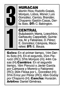 De salida, en mediocampo fue zona de disputa pero no de creación. El trabajo de los Quinteros y compañía y de los Carrizo y asociados se notó más que el de los encargados de generar pelotas bien jugadas y redondas para los de arriba: Moreno y Fabianesi más Ezequiel González compitieron con Chaparro –algo desubicado– y Brandán pero pocas veces pudieron superar marcas, tanto unos como otros. Sin embargo, como Huracán llegó al gol relativamente rápido, al filo del cuarto de hora, el partido se planteó con Central yendo a buscar y los de Babingtonn a esperar e ir de contra. Y eso, como suele suceder casi siempre cuando no hay ideas ni variantes ofensivas, favorece al que ha sacado ventaja. Y Huracán, tras la excelente jugada de Casas por derecha que terminó levantando la cabeza para dejarlo a Soto solo para convertir con un pase paralelo, pudo haber aumentado si cerraba con mayor seguridad un par de contras sobre el final del período: un penal de Marra a Soto que Giménez no vio y un centro de Brandán que peinó demasiado Casas. A todo esto, las aproximaciones de Central en el período pasaron por lo que hiciera Maceratesi, al que Ríos le sacó un toque sutil al palo.