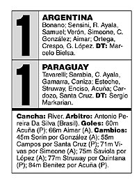 En un partido en el que pudo haber ganado por lo que hizo en el final, pero en el que casi nunca logró imponer el juego colectivo, Argentina empató 1-1 con Paraguay, que se fue del Monumental festejando el punto obtenido. El conjunto de Marcelo Bielsa no consiguió vulnerar el sobrio trabajo defensivo paraguayo, que con la simple misión de agrupar gente en el fondo complicó a un equipo al que le faltaron ideas y que recién en los últimos minutos demostró su mayor calidad.