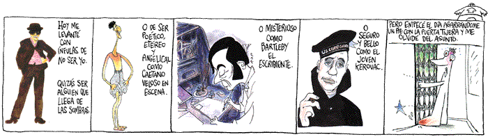 Gogol (levantándose): –¡Qué abominación tan vil! ¡Otra vez usted! ¡Usted no para ni un ratito! (Camina, choca con Pushkin y cae) ¡Parece que tropecé con Pushkin!