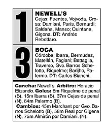![]() El equipo de Bianchi salió más decidido a conservar la punta del campeonato, y ya en los primeros minutos se paró en el campo de Newell’s. Rápidamente, a los cinco minutos, Boca se encontró con un penal a su favor luego de que París derribara, afuera del área, desde atrás a Barijho. Un minuto más tarde, Riquelme se encargó de marcar el primer gol del partido. Obligado por el resultado, Newell’s salió un poco más en busca del arco de Córdoba. Pero, sorpresivamente, Boca fue más profundo cada vez que iniciaba un contraataque. Y a los 15 minutos, Ibarra marcó el segundo tanto con una gran jugada por la derecha: el lateral se desprendió en ataque y luego de eludir a cuatro jugadores de Newell’s sacó un zurdazo que se clavó en el ángulo izquierdo de Cejas. A los 19 minutos, Elizondo le anuló un gol a Fuentes por posición adelantada. Por ese motivo, el partido estuvo dos minutos detenido, debido a que los hinchas locales comenzaron a arrojar zapatillas al área de Córdoba y hacia el juez de línea Claudio Rossi. Cuando todo volvió a la normalidad, Boca continuó llegando con peligro y se encontró más cerca del tercer gol. Primero lo tuvo Palermo, quien le pegó desde lejos cuando vio adelantado a Cejas. Después fue Barijho el que pudo haber aumentado, pero cuando fue a rematar se cruzó justo Bernardi. Mientras, Newell’s construyó su llegada más clara a los 29, cuando Quintana cabeceó al palo un centro de París. Pero iba a descontar a los 37 minutos con un penal del arquero Cejas, luego de una falta (no hubo contacto) de Matellán sobre París. En la segunda parte, Newell’s salió como para alcanzar el empate, pero Boca lo liquidó con un zurdazo de Palermo. El equipo de Bianchi pudo haber conseguido un resultado más abultado, pero la buena tarea del arquero Cejas se lo impidió. Así pasó Boca por Rosario, con mucha tranquilidad.