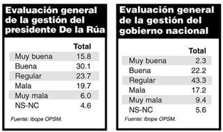 Hugo Haime: “Por el momento, el caso de las coimas no golpea la imagen personal de De la Rúa. Debe decirse que existen dos mediciones: la imagen del Presidente como dirigente y las opiniones sobre su gestión de gobierno. Esta última –la gestión de gobierno– está bastante mal, la gente ve escasos valores positivos. Pero la imagen personal del Presidente no baja. No está golpeada”.